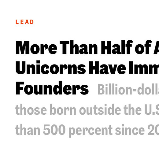 Now, it’s not shown here, but I quickly added up all European countries and they totaled ~21.28% of all the immigrant founders of foreign-born unicorn companies, so they are more than punching above their weight. Anglosphere countries came in at ~16.38%, but remember they make up a much smaller share of all immigrant STEM workers, given that Canada has the largest share among them which is only 2.2%, so they are also punching above their weight.