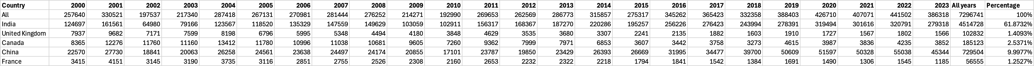 Since much of this debate has been concerned surrounding Elon’s seeming support for expanding H-1B visas, I gathered data from the United States Citizenship and Immigration Services. Let’s take Alec’s first image, that 65% of Top AI companies have immigrant founders. Well, fortunately for us, the National Foundation for American Policy gives us the place of origin of these founders and cofounders (Anderson, 2023, Tables 1 & 4). I got the share of H-1B beneficiaries for each year for India, the United Kingdom, Canada, China, and France from 2000-2023. The reason why the rest of the countries were excluded is because there were missing entries in some of the years for them. This is fine though because what expanding H-1Bs really means is just importing more Indians, and they are the primary subject of interest here anyways.
