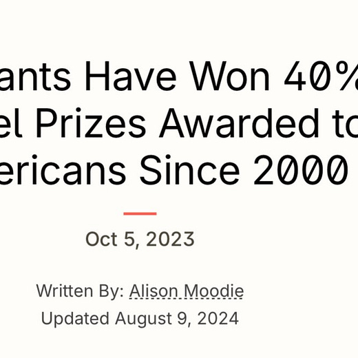 The irony here is that India did not even have a single person here on the list, while China had just one. India is consistently the largest beneficiary country of H-1B visas while China is the second largest. However, between China and India, the difference in the number of approved petitions isn’t even close, so in reality, it’s mostly just India gaming the H-1B system. European and Anglosphere countries each produced slightly over 38.6% of all immigrant Nobel prize winners for a total of nearly 77.3%. Anyone else starting to notice a pattern here?