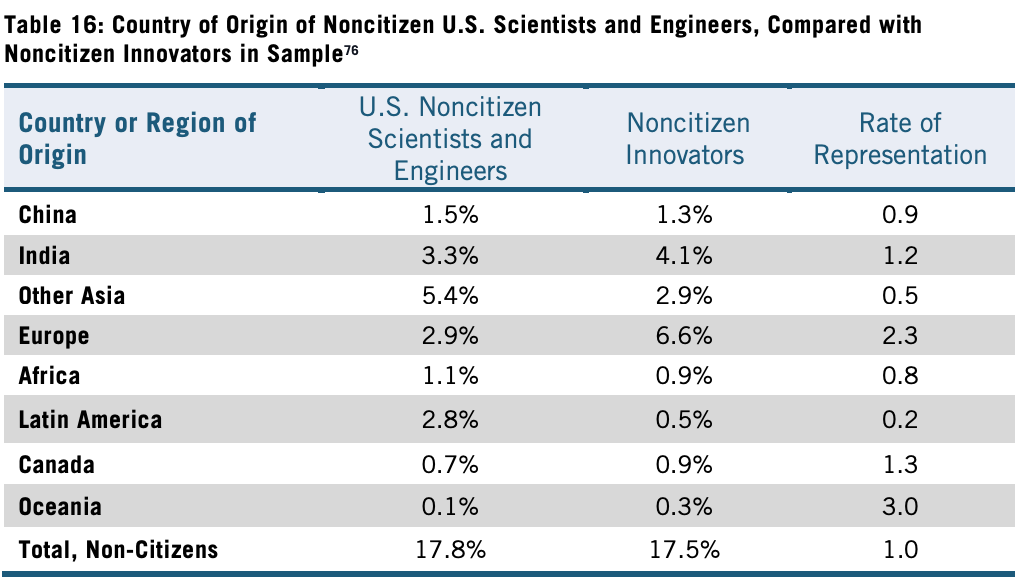 All of this also corroborates with Nager et al. (2016) which measured innovation via R&D awards and triadic patents for large tech companies, life sciences, information technology, and material sciences. When looking at the foreign-born population, Europeans and Asians are both extremely innovative, but Europeans especially so—with a rate of representation of 8.2 vs. 4.5 for Asians.