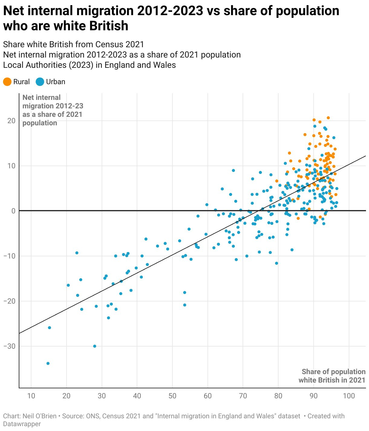 Another excellent post. On the last point, one of the more striking visuals is this map from Juice: https://x.com/juice8882/status/1952004458344300998/ note how inner London and Birmingham have seen a population collapse greater than economically disadvantaged areas like the South Yorkshire or South Wales coalfields, where few good jobs have been available since the 1980s.